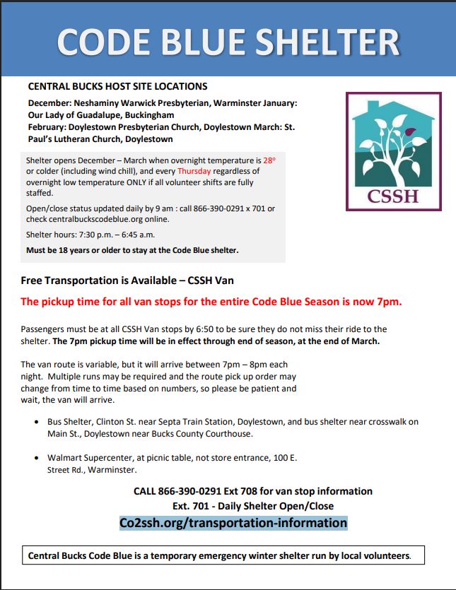 Coalition to Shelter and Support the Homeless (CSSH) operates the Code Blue Project in Central Bucks County. The Code Blue Project provides overnight shelter when the temperature is below 26 degrees or there is a prediction of excessive precipitation. The Code Blue Project season runs from December 1 through March 31. The Code Blue is located at: