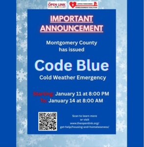 The CB Code Blue Shelter is located in Our Lady of Guadalupe Church, 5194 Cold Spring Creamery Road, Doylestown, PA from December 30 – January 29